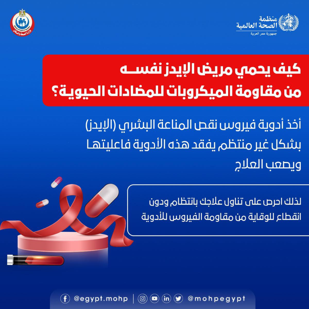 أوضحت وزارة الصحة عبر إنفوجرافًا نشرته على صفحتها الرسمية على موقع “فيسبوك، كيف يحمى مريض الإيدز نفسه من مقاومة الميكروبات للمضادات الحيوية.