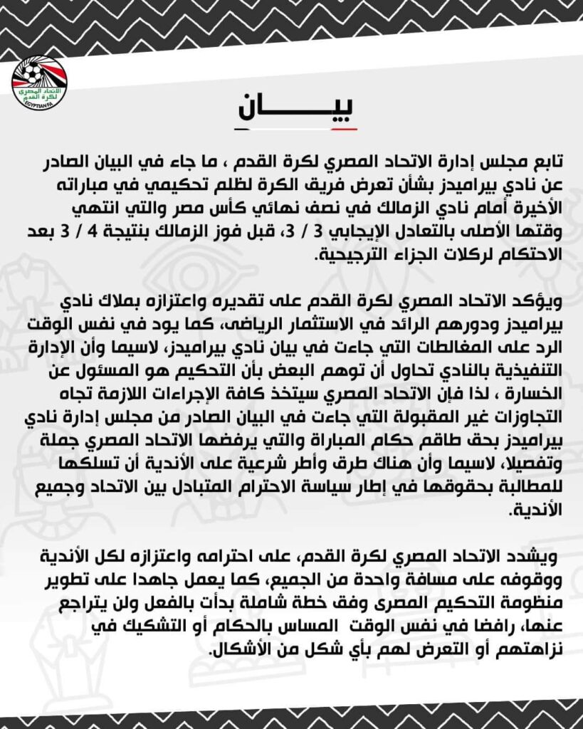 ويؤكد الاتحاد المصري لكرة القدم على تقديره واعتزازه بملاك نادي بيراميدز ودورهم الرائد في الاستثمار الرياضى، كما يود في نفس الوقت الرد على المغالطات التي جاءت في بيان نادي بيراميدز، لاسيما وأن الإدارة التنفيذية بالنادي تحاول أن توهم البعض بأن التحكيم هو المسئول عن الخسارة ، لذا فإن الاتحاد المصري سيتخذ كافة الإجراءات اللازمة تجاه التجاوزات غير المقبولة التي جاءت في البيان الصادر من مجلس إدارة نادي بيراميدز بحق طاقم حكام المباراة والتي يرفضها الاتحاد المصري جملة وتفصيلا، لاسيما وأن هناك طرق وأطر شرعية على الأندية أن تسلكها للمطالبة بحقوقها في إطار سياسة الاحترام المتبادل بين الاتحاد وجميع الأندية.