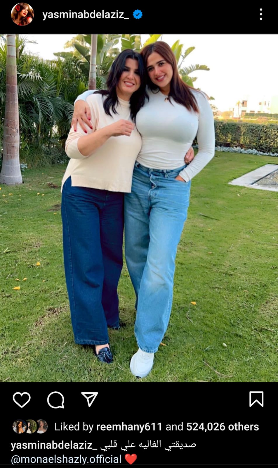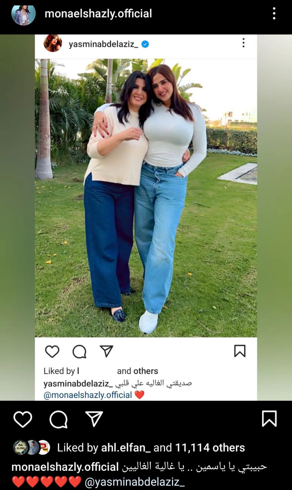 ياسمين عبد العزيز.. كما ردت الإعلامية منى الشاذلي على منشور ياسمين عبد العزيز بمنشور آخر نشرته على صفحتها الرسمية عبر موقع تبادل الصور والفيديوهات ” إنستجرام ” وعلقت قائلة ” حبيبتي يا ياسمين .. يا غالية الغاليين “.