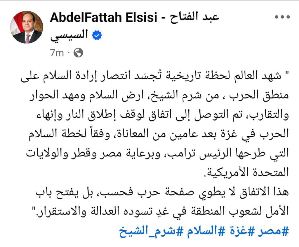 وأضاف الرئيس في منشور على صفحته الرسمية على موقع التواصل الاجتماعي «فيسبوك» أن هذا الاتفاق لا يطوي صفحة حرب فحسب، بل يفتح باب الأمل لشعوب المنطقة في غدٍ تسوده العدالة والاستقرار.