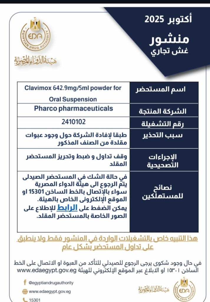 أصدرت هيئة الدواء المصرية منشورًا رسميًا في أكتوبر 2025 تحذر فيه من تداول عبوات مغشوشة من المستحضر الدوائي Clavimox 642.9mg/5ml powder for oral suspension، ويحمل رقم التشغيلة 2410102.
