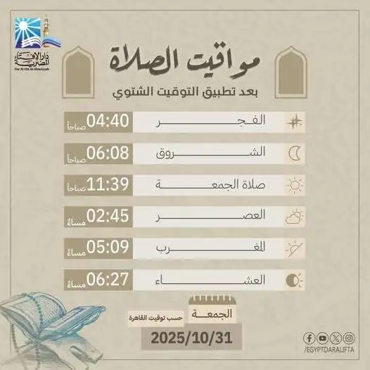 أعلنت دار الإفتاء المصرية مواعيد الصلاة ابتداءً من يوم الجمعة المقبل وفق التوقيت الشتوي، وذلك بحسب التوقيت المحلي لمدينة القاهرة، في إطار استعداد البلاد لتطبيق النظام الجديد رسميًا.