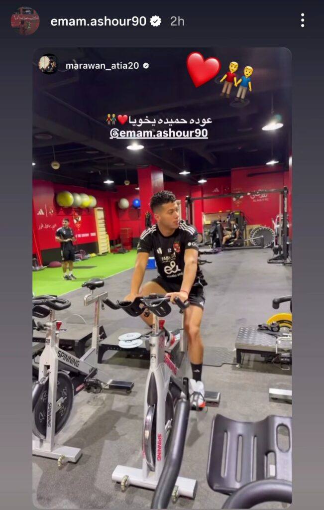 ونشر مروان عطية لاعب خط وسط الأحمر فيديو عبر حسابه بموقع انستجرام يظهر فيه إمام عاشور داخل صالة الجيم بالتتش، أثناء خوضه البرنامج التأهيلي الخاص به استعدادًا للعودة إلى التدريبات الجماعية للفريق.