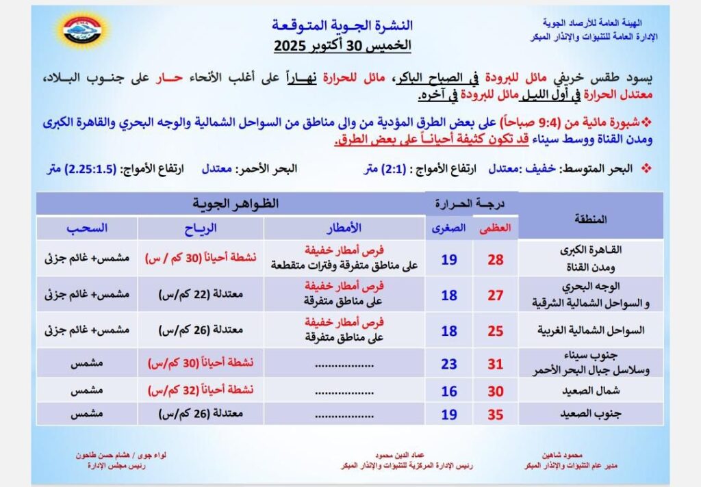 كشفت الهيئة العامة للأرصاد الجوية عن تفاصيل حالة الطقس المتوقعة اليوم الخميس 30- 10- 2025، حيث يسود طقس خريفي مائل للبرودة في الصباح الباكر، ومائل للحرارة نهارًا على أغلب الأنحاء، بينما يكون حارًا على جنوب البلاد وجنوب سيناء، ومعتدل الحرارة في أول الليل ومائلًا للبرودة في آخره.