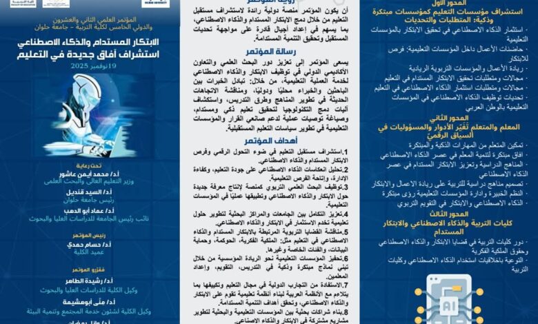 في إطار السياسة الوطنية للابتكار المستدام التي أطلقتها الدولة المصرية برعاية فخامة الرئيس عبد الفتاح السيسي، رئيس الجمهورية، لتعزيز القدرات الوطنية وتحقيق التنمية الشاملة في ضوء رؤية مصر 2030، تستعد كلية التربية بجامعة حلوان لتنظيم مؤتمرها العلمي الثاني والعشرين والدولي الخامس بعنوان «الابتكار المستدام واستشراف آفاق جديدة في التعليم»، والمقرر انعقاده يوم الأربعاء الموافق 19 نوفمبر 2025