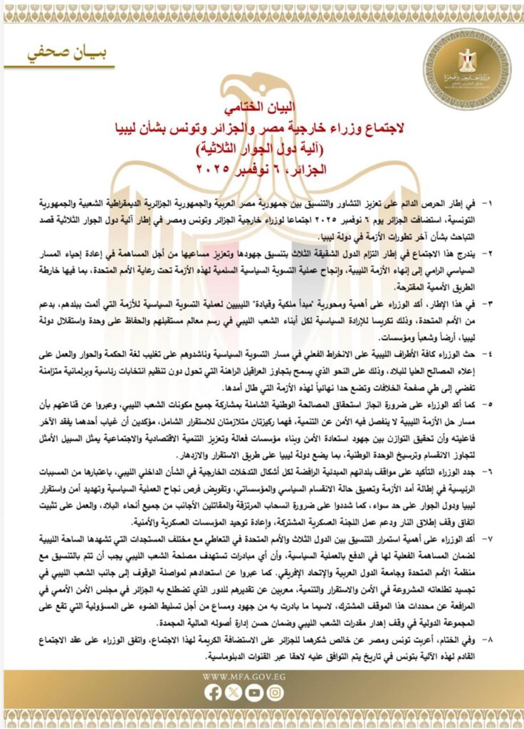 عاجل.. البيان الختامي لاجتماع وزراء خارجية مصر والجزائر وتونس بشأن ليبيا