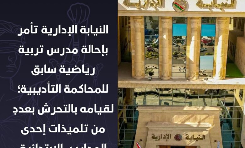 أمرت النيابة الإدارية بإحالة مدرس تربية رياضية سابق بإحدى المدارس الابتدائية التابعة للإدارة التعليمية بمنيا القمح إلى المحاكمة التأديبية؛ وذلك على خلفية قيامه بالتحرش الجنسي بعددٍ من تلميذات الصفين الأول والثاني الابتدائي بالمدرسة.