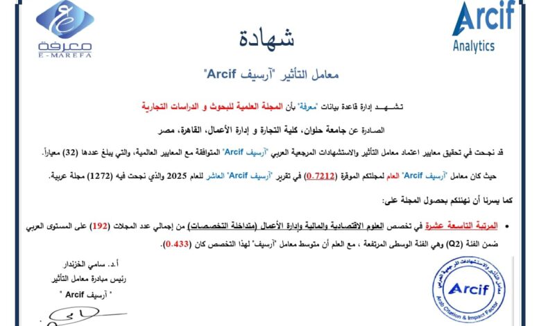 في إنجازٍ علمي جديد يُضاف إلى سجل التميز الأكاديمي لجامعة حلوان، أعلن معامل التأثير والاستشهادات المرجعية للمجلات العلمية العربية (أرسيف – ARCIF)، أحد مبادرات قاعدة بيانات “معرفة” للإنتاج والمحتوى العلمي، عن إدراج المجلة العلمية للبحوث والدراسات التجارية الصادرة عن كلية التجارة وإدارة الأعمال بجامعة حلوان ضمن قوائم المجلات المعتمدة لعام 2025، بعد نجاحها في تحقيق المعايير العالمية لاعتماد معامل أرسيف، والتي يبلغ عددها (32) معيارًا دوليًّا