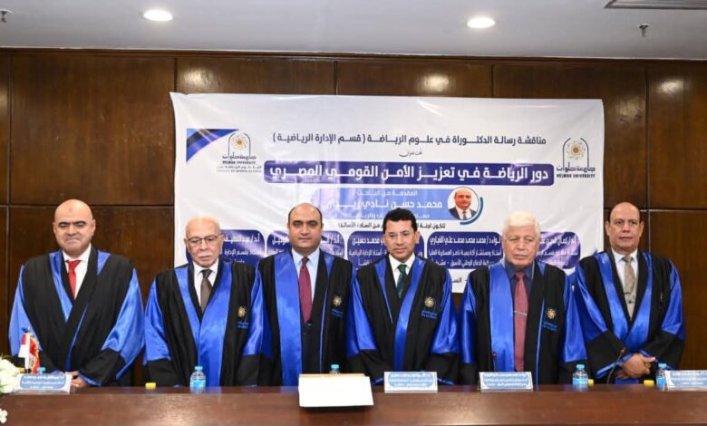 شهد مجمع الفنون والثقافة بجامعة حلوان تحت رعاية الدكتور السيد قنديل رئيس الجامعة، مناقشة رسالة دكتوراه مقدمة من الباحث محمد حسن، معاون وزير الشباب والرياضة، بعنوان «دور الرياضة في تعزيز الأمن القومي المصري».