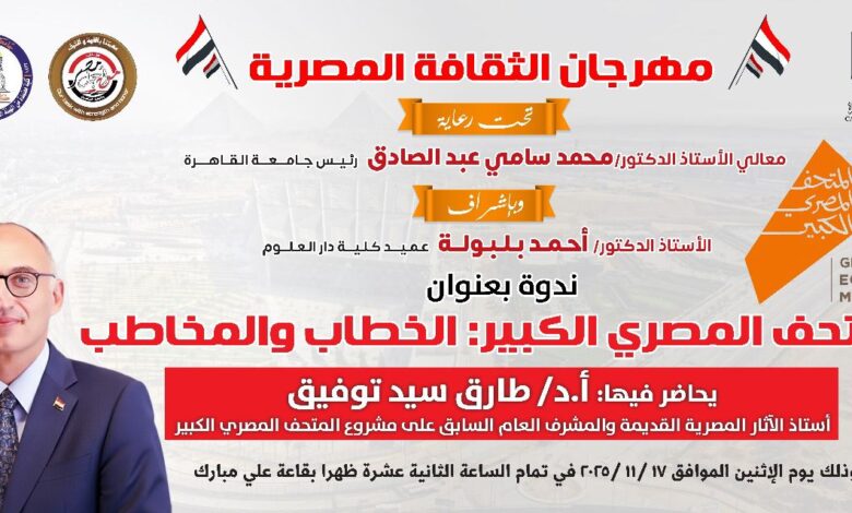 ويحاضر في الندوة الدكتور طارق سيد توفيق، أستاذ الآثار المصرية القديمة والمشرف العام السابق على مشروع المتحف المصري الكبير، حيث يناقش الأسس الخطابية التي يقدم من خلالها المتحف رسائله الحضارية، وطبيعة المخاطَب المصري والعالمي في ظل السياق الثقافي الراهن.