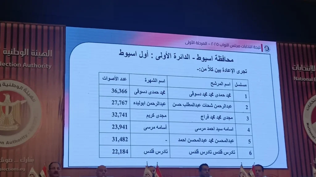 أعلنت الهيئة الوطنية للانتخابات إجراء جولة الإعادة بمحافظة أسيوط – الدائرة الأولى : أول أسيوط بانتخابات مجلس النواب بين كل من محمد حمدى دسوقى وعبد الرحمن أبو لبده ومجدي كريم وأسامة مرسى وعبد المحسن محمد عبد المحسن وتادرس قلدس تادرس.