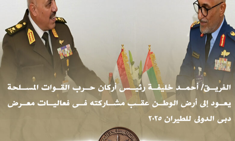 عاد إلى أرض الوطن الفريق أحمد خليفة رئيس أركان حرب القوات المسلحة عقب إنتهاء زيارته الرسمية لدولة الإمارات العربية المتحدة لحضور فعاليات معرض “دبى الدولى للطيران 2025″، على رأس وفد عسكرى رفيع المستوى تضمن قائد قوات الدفاع الجوى وقائد القوات الجوية وعدد من قادة وضباط القوات المسلحة.