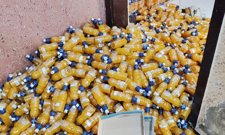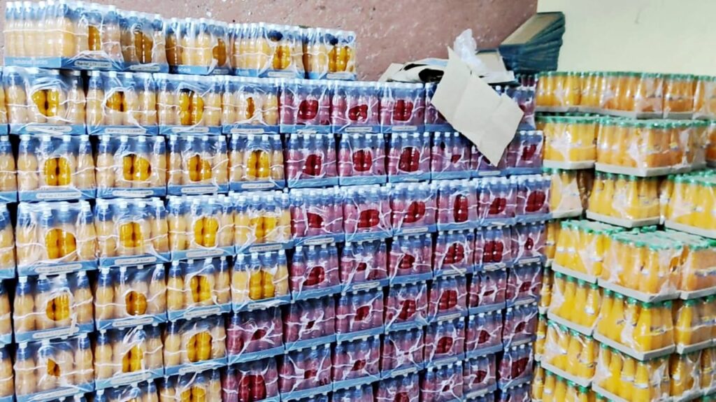حيث تم ضبط ٤ ألاف لتر مادة سائلة مجهولة المصدر داخل تنكات بلاستيكية، 40 ألـف زجاجة بلاستيك فارغة لزوم التعبئة، ٤ ألاف كرتونة شرنيك فارغة لزوم التعبئة،٢٦٤٠٠ زجاجة عصير منتج نهائي ، ٢ ميزان إلكتروني ،وتم التحفظ علي المضبوطات والعرض علي النيابة العامة لاتخاذ الإجراءات القانونية اللازمة حيال المخالفين، يأتي هذا في إطار إحكام الرقابة الميدانية الصارمة على الأسواق حفاظا على صحة وسلامة المواطنين .