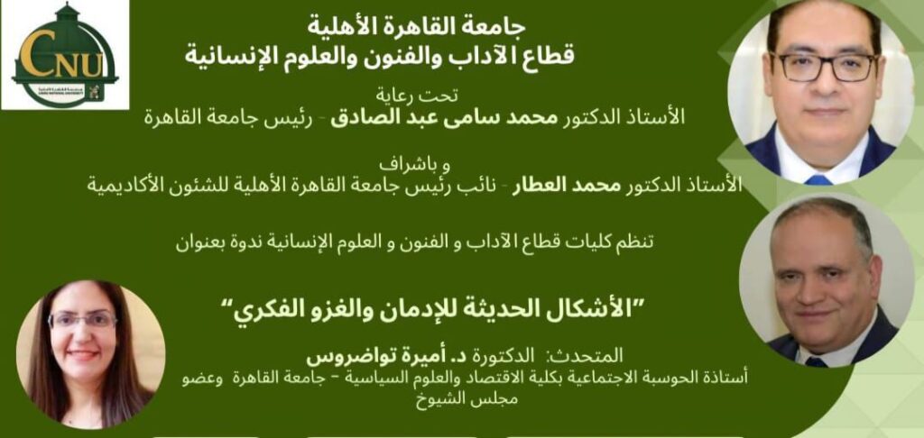 نظم قطاع الآداب والفنون والعلوم الإنسانية بجامعة القاهرة الأهلية تحت رعاية الدكتور محمد سامي عبدالصادق المكلف بأعمال رئيس الجامعة، ندوة علمية تحت عنوان “الأشكال الحديثة للإدمان والغزو الفكري”، حاضر خلالها الدكتورة أميرة تواضروس الاستاذ بقسم الحوسبة الاجتماعية بكلية الاقتصاد والعلوم السياسية بجامعة القاهرة وعضو مجلس الشيوخ، وأدارت الندوة الدكتورة رشا رمضان أستاذ الاقتصاد بكلية الاقتصاد والعلوم السياسة