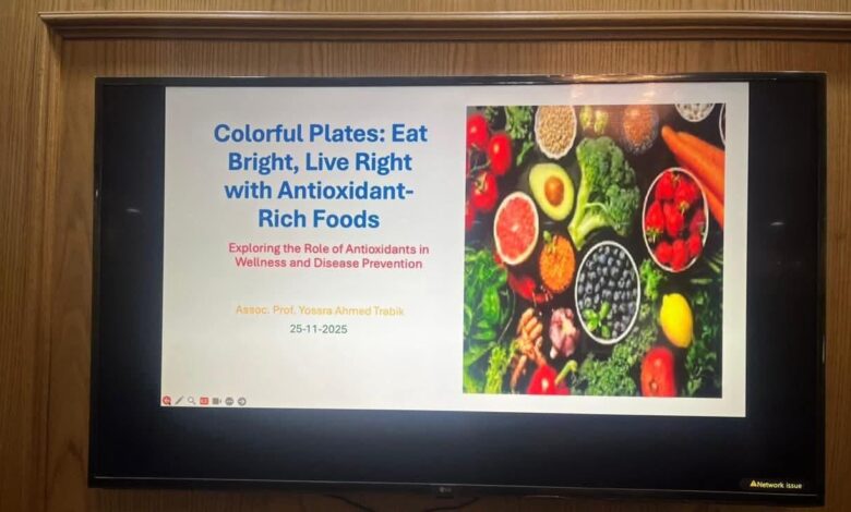 كما تناولت المحاضرة عرضا لأهم الفواكه والبقوليات والخضروات التي تحتوي على أعلى نسب من مضادات الأكسدة، مع توضيح مكونات كل منها وفوائدها الصحية في الوقاية ودعم صحة الإنسان.