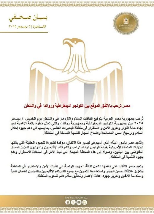 رحبت جمهورية مصر العربية بتوقيع اتفاقات السلام والازدهار في واشنطن أمس /الخميس/ بين جمهورية الكونغو الديمقراطية وجمهورية رواندا، والتي تمثل خطوة بالغة الأهمية نحو إنهاء حالة التوتر وتعزيز الأمن والاستقرار في منطقة البحيرات العظمى، بما يسهم في دعم جهود إحلال السلام وترسيخ أسس المصالحة وإفساح المجال للتنمية الشاملة في المنطقة.