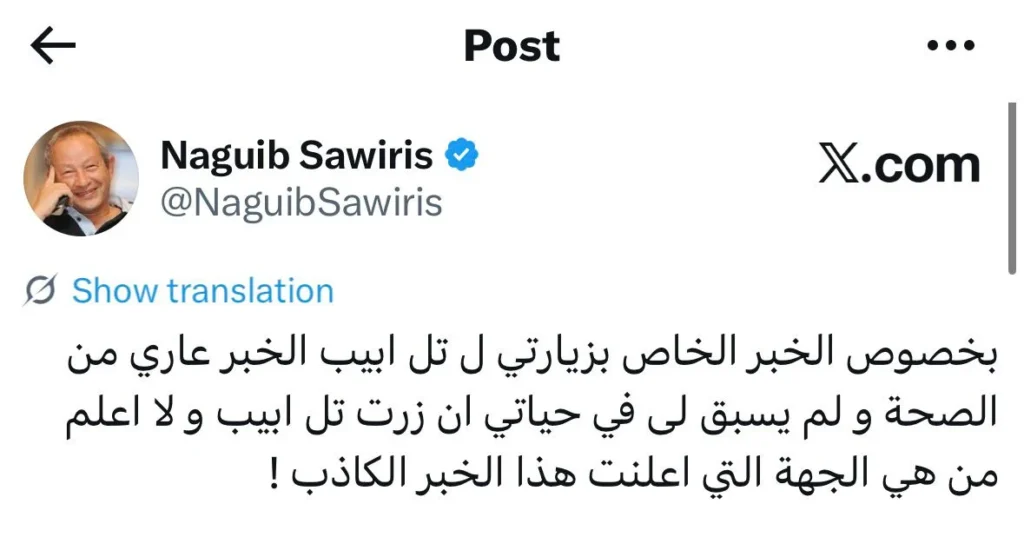 نفي رجل الأعمال نجيب ساويرس، ما تم تداوله حول زيارته لإسرائيل الأسبوع الماضي، وقال ساويرس في تدوينه له على موقع X: “بخصوص الخبر الخاص بزيارتي لتل أبيب.. الخبر عاري من الصحة، ولم يسبق لى في حياتي ان زرت تل أبيب، و لا أعلم من هي الجهة التي أعلنت هذا الخبر الكاذب”.
