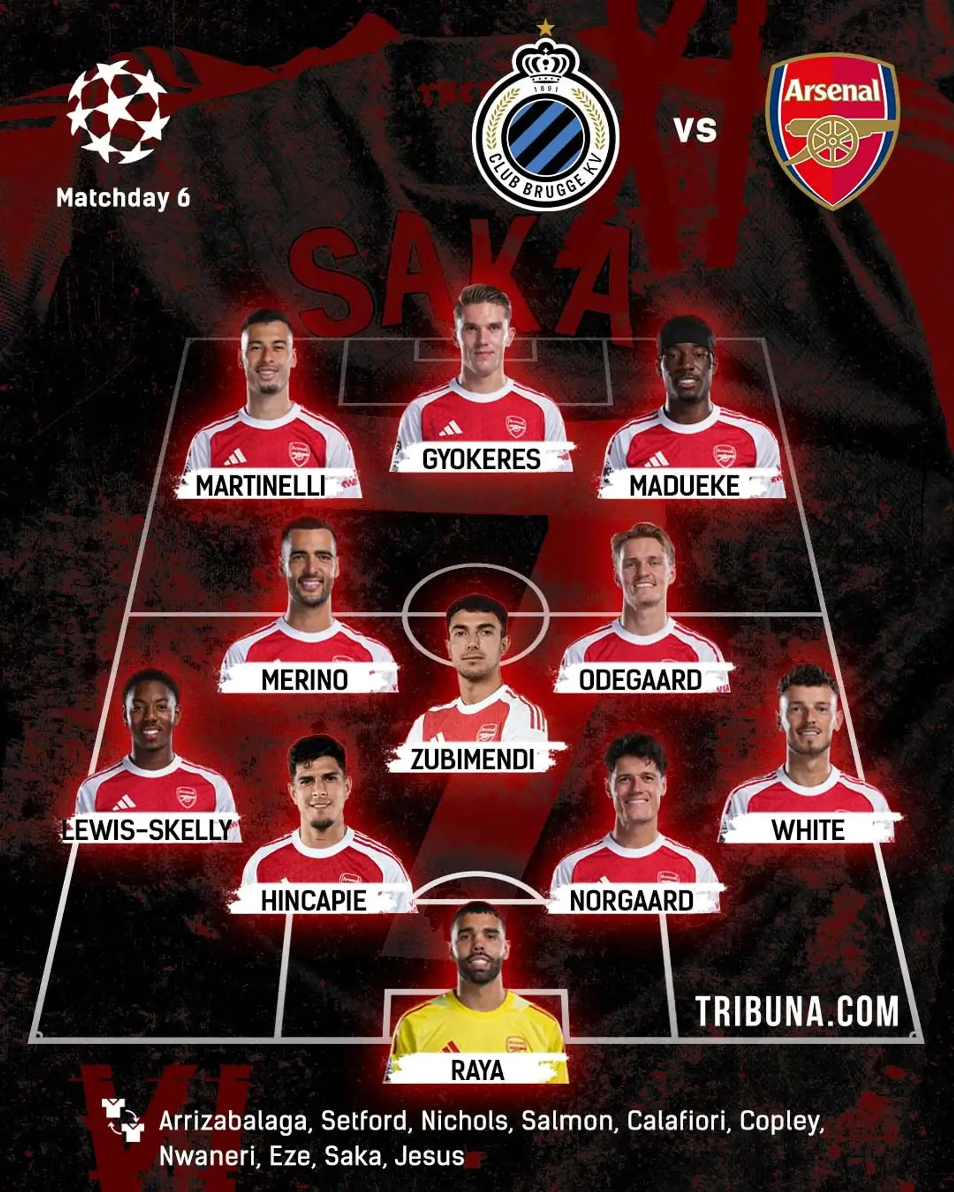 ويجلس على مقاعد البدلاء نجوم بارزون مثل بوكايو ساكا وجابرييل جيسوس.