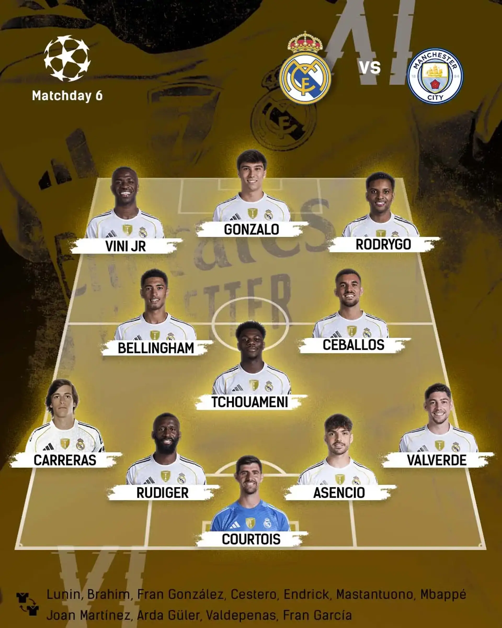 بيلينجهام وفينيسيوس يقودان تشكيلة ريال مدريد لمواجهة مانشستر سيتي