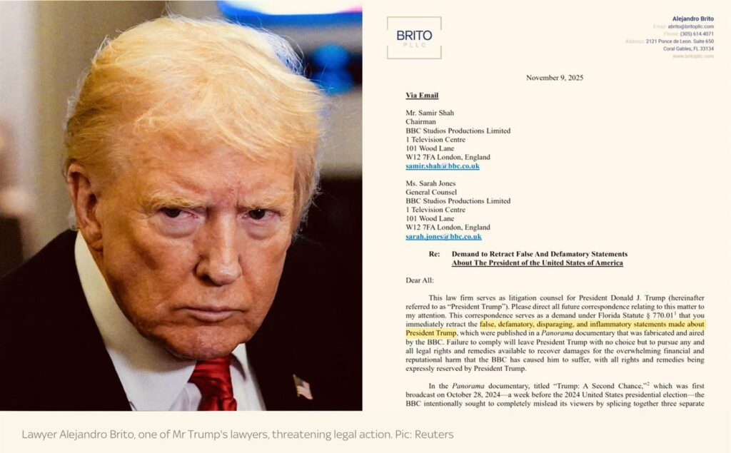 واتهمت الدعوى، التي بلغت 33 صفحة، هيئة الإذاعة البريطانية ببث “تصوير كاذب ومشوه ومسيء ومثير للجدل وخبيث للرئيس ترامب”، ووصفتها بأنها “محاولة صارخة للتدخل والتأثير” في الانتخابات الرئاسية الأمريكية لعام 2024.