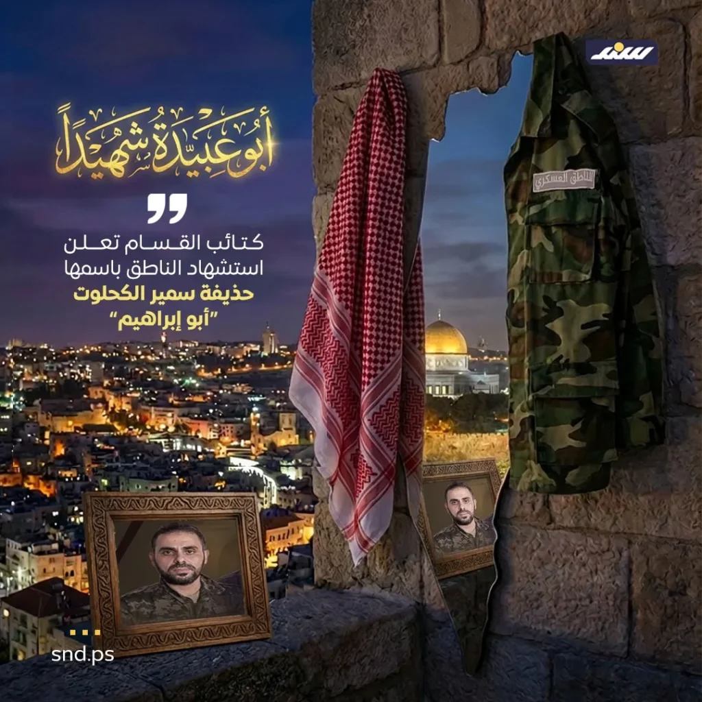 وأضاف البيان: «الملثم، صاحب الكوفية الحمراء، صوت الأمة الهادر، قائد إعلام القسام أبو عبيدة، لم ينقطع يومًا عن شعبه في أحلك الظروف، وخاطبهم دائمًا من قلب المعركة». وتابع البيان: «نودّع القائد حذيفة الكحلوت، الذي ورثنا عنه لقب أبو عبيدة، وعهدًا بأن نواصل المسير. لقد كان السابع من أكتوبر انفجارًا مدويًا في وجه الظلم والقهر والحصار، وجاء طوفان الأقصى ليعيد القضية الفلسطينية إلى صدارة المشهد، ويوقظ ضمائر الأحرار في العالم».