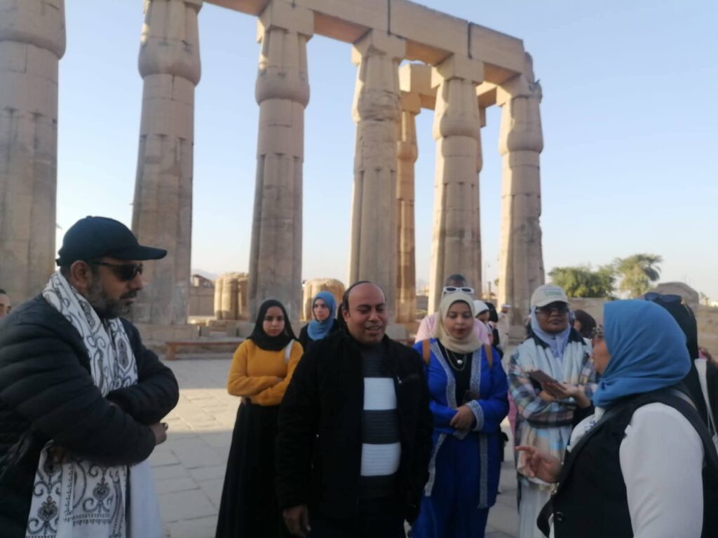 واستهلت الفعاليات بالتعرف على تاريخ ذلك الصرح الأثري برفقة محمد الليثي، كبير مفتشي المعبد، موضحا أنه يُعرف بـ”درة المعابد” لوقوعه في قلب الأقصر، ويتميز بتصميمه الهندسي الفريد وأعمدته الضخمة، ويضم مجموعة كبيرة من الآثار المصرية القديمة، إلى جانب آثار من عصور لاحقة تعكس تطور الفن المصري عبر العصور، مشيرا إلى أن مدخل المعبد يضم طريق الكباش الذي يربط بين معبدي الكرنك والأقصر، ويمتد لمسافة تقارب 3 كيلومترات.