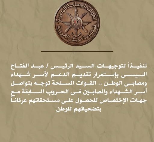 تنفيذاً لتوجيهات الرئيس عبد الفتاح السيسى رئيس الجمهورية القائد الأعلى للقوات المسلحة بشأن ضم شهداء ومصابى الحروب السابقة من القوات المسلحة فى ( حرب 1948- حرب اليمن – حرب 1956- حرب الإستنزاف – حرب1973 ) للفئات المستحقة للتعويض المادى عرفاناً بتضحياتهم للوطن ، حيث يقوم صندوق تكريم شهداء وضحايا ومفقودى ومصابى العمليات الحربية وأسرهم بصرف التعويض المادى الواجب صرفه لمرة واحدة للمستفيدين من الصندوق من القوات المسلحة بمبلغ 100 ألف جنيهاً لأسرة الشهيد والمصاب طبقاً لنسبة العجز ، والمستفيد من أسرة الشهيد هم ( الأب – الأم – الزوجة – الأبناء ) والمصاب نفسه وفى حالة وفاة المصاب يتم الصرف للورثة ( الأب – الأم – الزوجة – الأبناء ) .