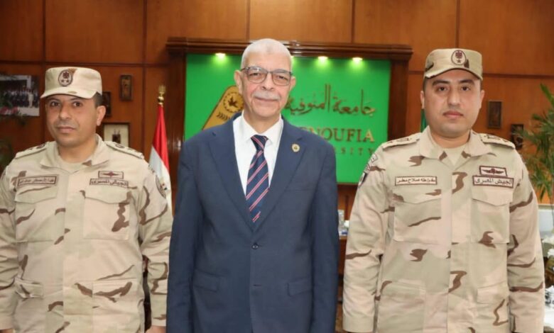رئيس جامعة المنوفية يكرم مدير التربية العسكرية السابق ويعقد لقاءً مع المدير الجديد