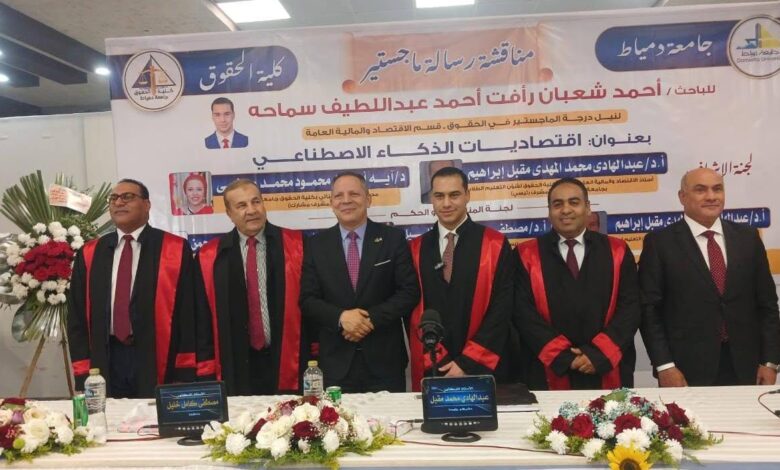 وفي كلمته، أكد الأستاذ الدكتور حمدان ربيع، رئيس جامعة دمياط، حرص الجامعة على دعم البحث العلمي الجاد وتشجيع الدراسات التي تتناول القضايا المعاصرة، مشيرًا إلى أن موضوع الرسالة يعكس وعيًا علميًا بأهمية الذكاء الاصطناعي وتطبيقاته الاقتصادية وانعكاساته القانونية، بما يسهم في خدمة خطط التنمية ومواكبة التحولات الرقمية المتسارعة.