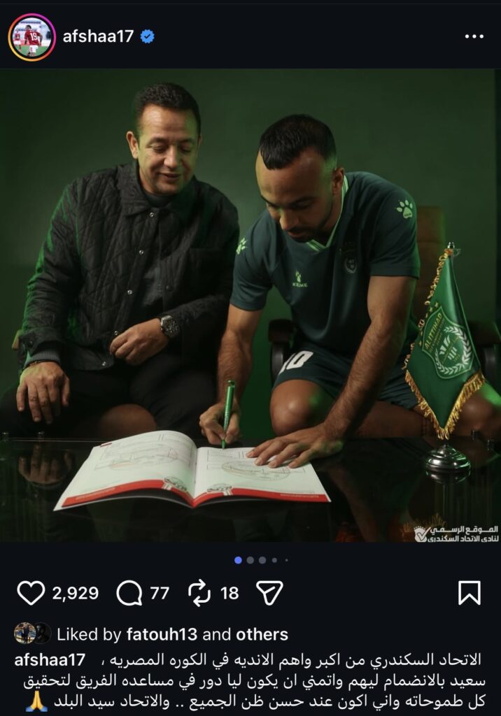ونشر أفشة صور له بتيشيرت الإتحاد عبر حسابه الشخصي بموقع إنستجرام وعلق عليها قائلاً: “الاتحاد السكندري من اكبر وأهم الاندية في الكوره المصرية”.