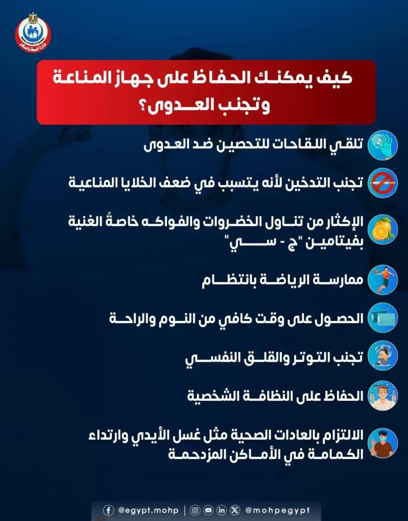 وركزت الوزارة على ضرورة تبني نمط حياة صحي يبدأ بتلقي اللقاحات اللازمة للتحصين ضد العدوى، وتجنب التدخين الذي يؤدي مباشرة إلى ضعف الخلايا المناعية.