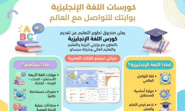 وتهدف المقررات إلى تمكين الدارسين من إتقان مستويات B1 – B2، من خلال التركيز على المهارات اللغوية الأربع، «التحدث – الاستماع – القراءة – الكتابة»، بما يؤهل المتدربين للحصول على شهادات دولية معتمدة لإتقان اللغة الإنجليزية، ويأتي إطلاق هذه المقررات في إطار التعاون بين صندوق تطوير التعليم، ووزارتي التربية والتعليم، والتعليم العالي والبحث العلمي، وبالشراكة مع شركة سيسكو (Cisco)، بما يضمن تقديم محتوى تدريبي حديث وفقًا للمعايير الدولية وباستخدام أحدث الوسائل التكنولوجية في التعليم .