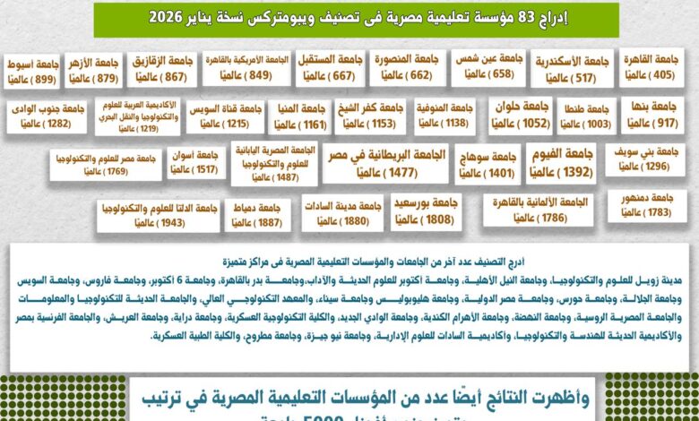 إدراج 83 مؤسسة تعليمية مصرية في تصنيف ويبومتركس العالمي نسخة يناير 2026