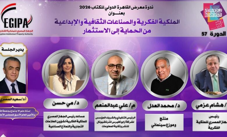 ينظم الجهاز المصري للملكية الفكرية ندوة فكرية بعنوان «الملكية الفكرية والصناعات الثقافية والإبداعية: من الحماية إلى الاستثمار»، ضمن البرنامج الثقافي لمعرض القاهرة الدولي للكتاب، في تمام الساعة الثانية عشرة ظهر غد السبت، بصالة 4 بلازا 2، وذلك في إطار مشاركة الجهاز الأولى في معرض القاهرة الدولي للكتاب،