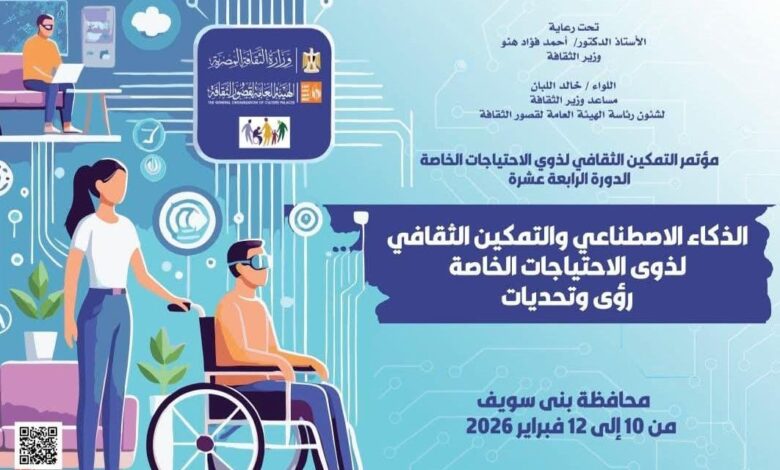 يشهد ديوان عام محافظة بني سويف، في العاشرة صباح الثلاثاء المقبل، انطلاق فعاليات مؤتمر “الذكاء الاصطناعي والتمكين الثقافي لذوي الاحتياجات الخاصة.. رؤى وتحديات”، في دورته الرابعة عشرة، وذلك برعاية الدكتور أحمد فؤاد هنو، وزير الثقافة، والدكتور محمد هاني غنيم، محافظ بني سويف، وتنظمه الهيئة العامة لقصور الثقافة، برئاسة اللواء خالد اللبان، حتى 12 فبراير الجاري، في إطار برامج وزارة الثقافة.
