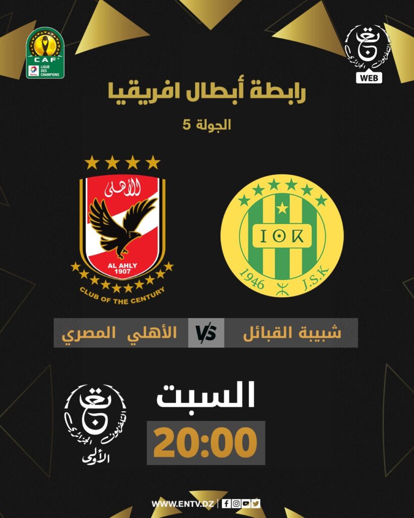 يحتضن ملعب استاد «حسين آيت أحمد» لقاء الأهلي وشبيبة القبائل الجزائري في إطار منافسات الجولة الخامسة من دور المجموعات بدوري أبطال أفريقيا 2026.