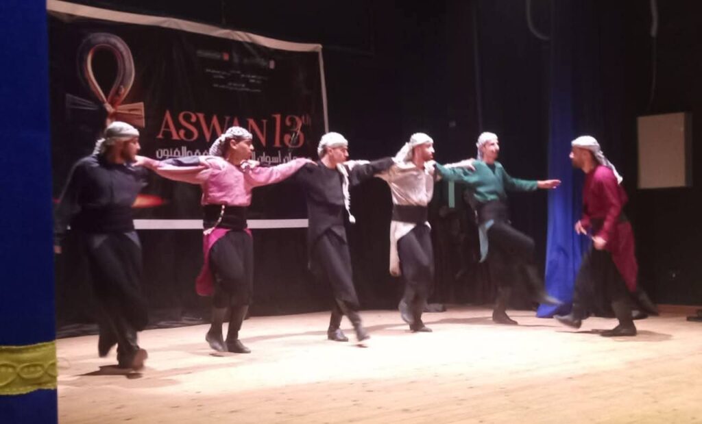 وعلى مسرح قصر ثقافة توشكى تفاعل الجمهور مع فرقة “وطن للفنون” الفلسطينية، للمدرب مجاهد السوسي، من خلال عروض “الدبكة”، و”دمي فلسطيني”، بمصاحبة الأغاني التراثية.