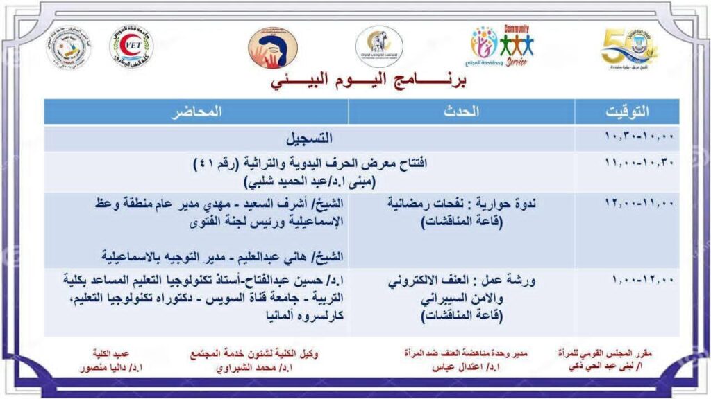 ويختتم اليوم فعالياته بورشة عمل هامة حول العنف الإلكتروني والأمن السيبراني، يقدمها الدكتور حسين عبد الفتاح، أستاذ تكنولوجيا التعليم المساعد بكلية التربية بجامعة قناة السويس والحاصل على الدكتوراه من جامعة كارلسروه بألمانيا، وذلك بحضور الأستاذة لبنى عبد الحي ذكي، مقرر المجلس القومي للمرأة، و الدكتورة اعتدال عباس، مدير وحدة مناهضة العنف ضد المرأة بالجامعة، وسط تطلعات بأن يحقق اليوم أهدافه في تعزيز الوعي الثقافي والتقني لدى الحضور، وتسليط الضوء على قضايا الأمن الرقمي ومخاطر العنف الإلكتروني وسبل الوقاية منه.