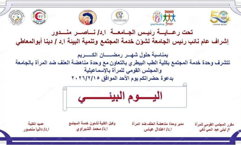 وتتشرف وحدة خدمة المجتمع، بالتعاون مع وحدة مناهضة العنف ضد المرأة والمجلس القومي للمرأة بالإسماعيلية، بدعوة حضراتكم لحضور اليوم البيئي المتميز يوم الأحد الموافق 15 فبراير 2026، في إطار حرص الجامعة على توسيع قاعدة المشاركة المجتمعية، وترسيخ ثقافة الوعي البيئي والثقافي والتقني بين مختلف فئات المجتمع.