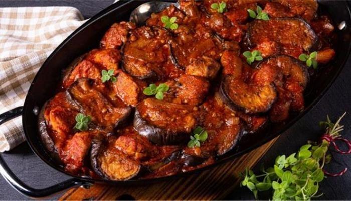 -يُغطى الوجه ببقية شرائح الباذنجان، ويمكن إضافة القليل من صلصة الطماطم على السطح.