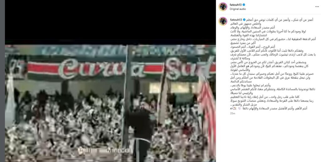 وأضاف :” لولا وجودكم ما كنا أحرزنا بطولات في السنين الماضية، ولا كانت انتصاراتنا بهذه القوة والعظمة، أنتم الدفعة الحقيقية لنا، حضوركم في كل المباريات، داخل وخارج مصر، أكبر من مجرد تشجيع.