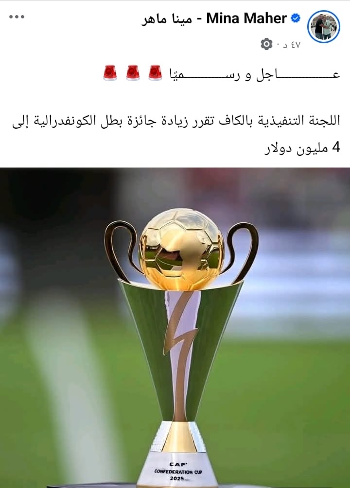 وكتب الإعلامي مينا ماهر عبر حسابه علي فيسبوك “عــاجل و رسـميًا اللجنة التنفيذية بالكاف تقرر زيادة جائزة بطل الكونفدرالية إلى 4 مليون دولار”.
