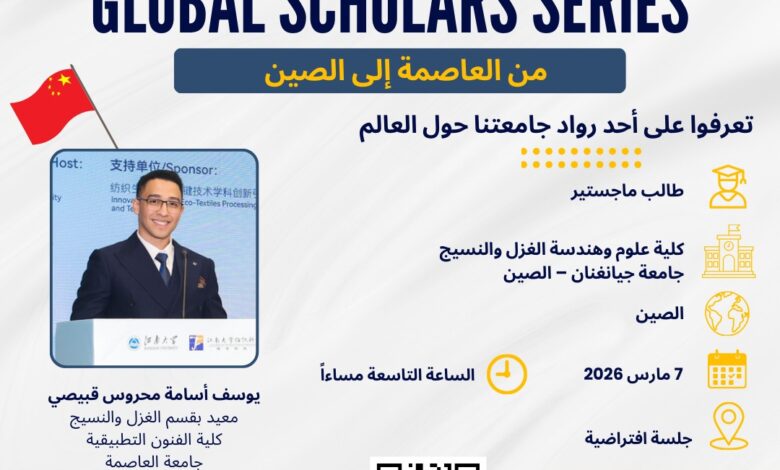 في إطار استراتيجية جامعة العاصمة (حلوان سابقًا) لتعزيز التدويل، ودعم التميز الأكاديمي، وتمكين طلابها وباحثيها من المنافسة عالميًا، يُطلق مكتب العلاقات الدولية مبادرة *“سلسلة *روّاد العاصمة حول العالم – Capital Global Scholars Series”*، والتي تهدف إلى تسليط الضوء على تجارب طلاب الجامعة وأعضاء هيئة التدجريس الدارسين بالخارج من خلال المنح الدراسية الدولية والزمالات الأكاديمية بمختلف دول العالم