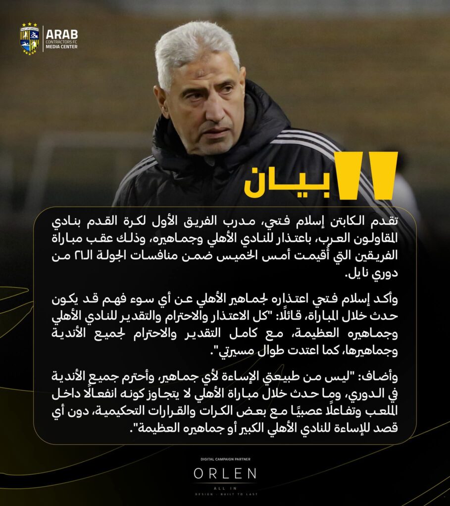 تقدم إسلام فتحي مدرب فريق المقاولون العرب باعتذار رسمي للنادي الأهلي وجماهيره، وذلك عقب مباراة الفريقين التي أقيمت أمس الخميس، ضمن منافسات الجولة الـ20 من الدوري المصري الممتاز.