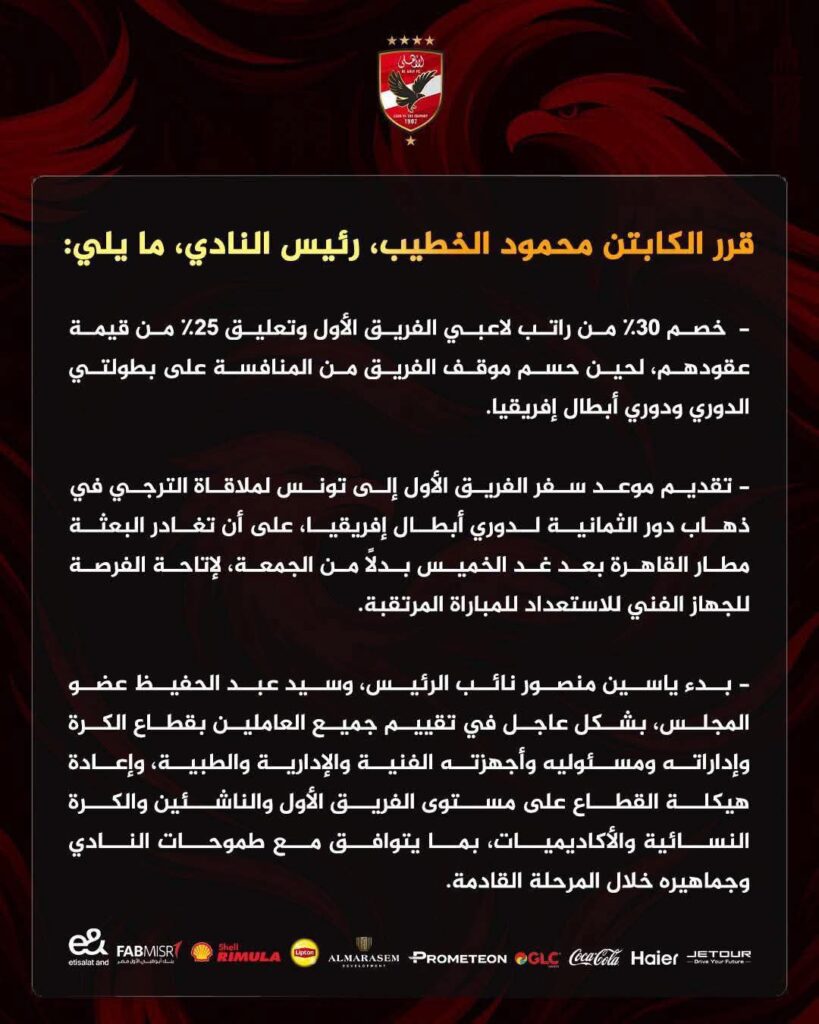 أولا: خصم 30% من راتب لاعبي الفريق الأول وتعليق 25% من قيمة عقودهم، لحين حسم موقف الفريق من المنافسة على بطولتي الدوري ودوري أبطال إفريقيا.