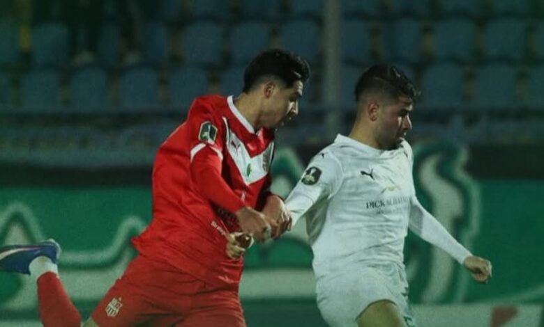 محاولات الخروج بالكرة من قبل لاعبي شباب بلوزداد بسبب الضغط المتقدم من قبل لاعبي المصري.