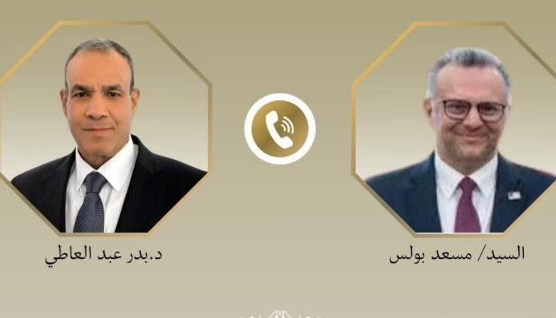 تلقي د. بدر عبد العاطي وزير الخارجية والتعاون الدولي والمصريين بالخارج اتصالاً هاتفياً من السيد “مسعد بولس”، كبير مستشاري الرئيس الأمريكي للشئون العربية والأفريقية، وذلك في إطار التنسيق والتشاور المستمر بين القاهرة وواشنطن إزاء القضايا الإقليمية والدولية.