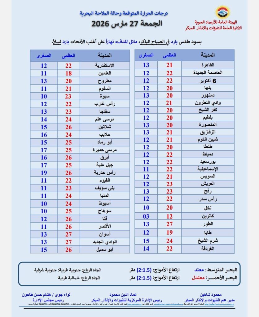 أعلنت الهيئة العامة للأرصاد الجوية عن تحسن ملحوظ في الأحوال الجوية على أغلب أنحاء الجمهورية غدًا الجمعة 27 مارس 2026، بعد موجة من التقلبات الجوية التي شهدتها البلاد مؤخراً، لتُسجل بذلك استقرارًا نسبيًا في الطقس خلال اليوم.