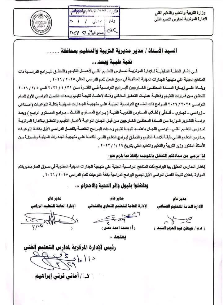 وأشارت إلى أنه بناء على زيارة المحققين الخارجيين للبرامج الدراسية في الفترة من ٣١ / ١ / ٢٠٢٦ الي ٢/٥ / ٢٠٢٦ للتحقق من قرارات التقييم وفعالية عمليات التحقق الداخلي وذلك لاعتماد نتيجة تقييم وحدات الفصل الدراسي الأول للعام الدراسي ٢٠٢٥ / ٢٠٢٦ للبرامج ذات المناهج الدراسية المبنية على منهجية الجدارات المهنية بكافة النوعيات ( صناعي زراعي – تجاري – فندقي ) لطلاب المدارس الثانوية الفنية ) برامج المستوي الثالث – برامج المستوي الرابع ) وبعد دراسة التقارير الواردة من السادة المحققين الخارجيين من قبل اللجان النوعية لأعمال التقييم والتحقق بالإدارة المركزية المدارس التعليم الفني، توصي اللجان باعتماد نتيجة تقييم وحدات البرامج الخاصة بالفصل الدراسي الأول بكافة النوعيات بمدارس التعليم الفني طبقًا للائحة التقييم والتحقق لبرامج التعليم الفني القائمة على منهجية الجدارات المهنية والمعدلة من الدكتور وزير التربية والتعليم والتعليم الفني بتاريخ ۱/۱۹ / ۲۰۲۲.