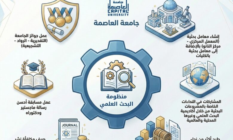 في إطار توجه الدولة نحو دعم البحث العلمي والابتكار، تواصل جامعة العاصمة جهودها المتكاملة للارتقاء بالمنظومة البحثية، من خلال إطلاق عدد من المبادرات والبرامج التي تستهدف تحفيز الباحثين، وتعزيز جودة المخرجات العلمية، وربطها باحتياجات المجتمع وخطط التنمية المستدامة